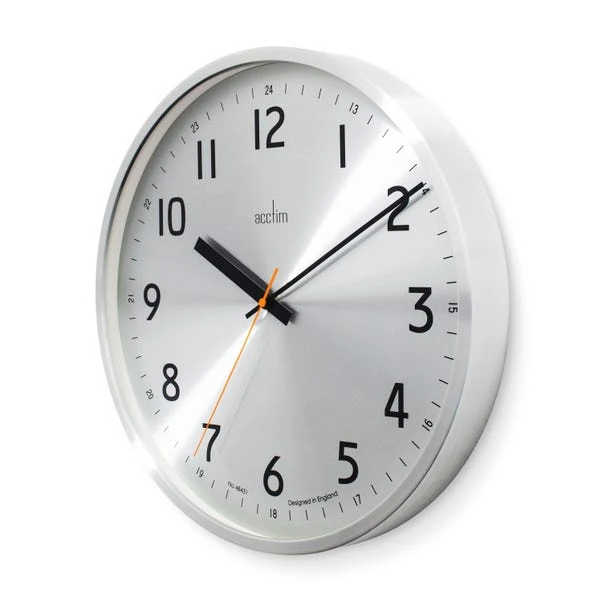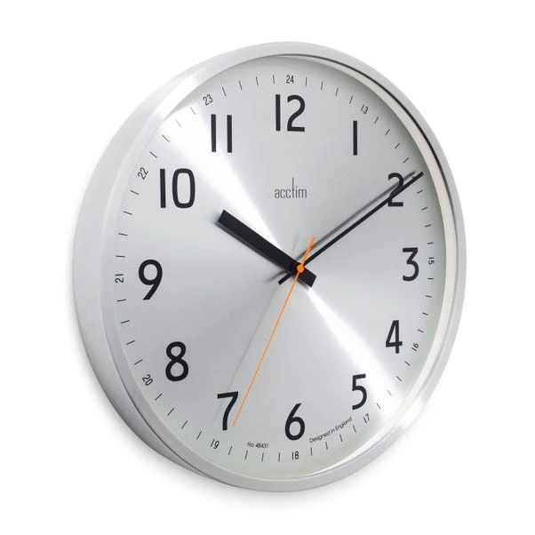 Decked in silver, Klar is a substantial clock proudly displaying its solid, brushed finish metal case and spun metal dial. Keep track of time with the non-ticking sweep seconds hand giving an accent of colour against the stylish geometric font dial.