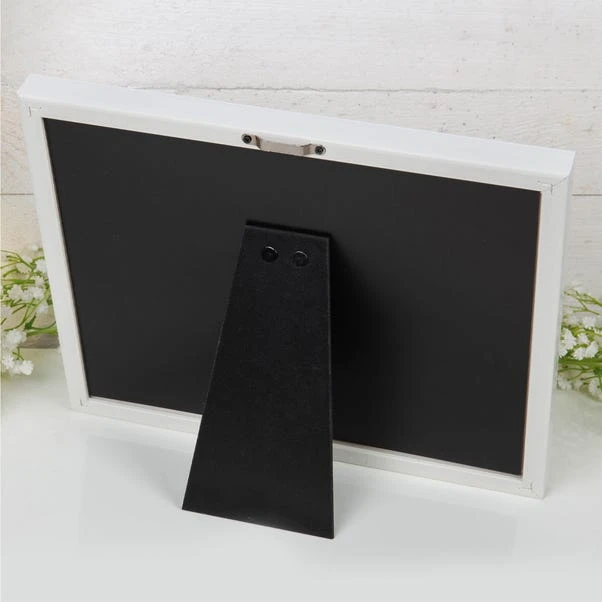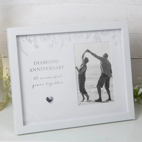 Celebrate 60 wonderful years together with this elegant diamond wedding anniversary photo frame from AMORE. This exquisite frame features a crisp white wooden border and a white card mount with a silver foil debossed floral design. The “DIAMOND ANNIVERSARY” title and “60 wonderful years together” sentiment are elegantly displayed in silver foil, accompanied by a silver-plated heart icon. It holds a 4″ x 6″ portrait photo and includes an easel-style standing strut, hanging hook, and a gift box, making it the perfect gift for a diamond anniversary.
