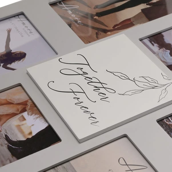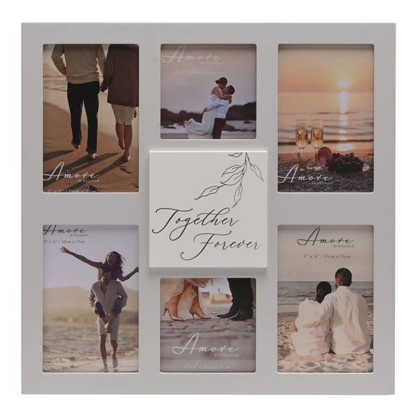 The Forever multi-aperture photo frame by AMORE is a stunning way for couples to celebrate their love and commitment. This grey wooden photo frame features four portrait apertures and two square apertures, centered around a silver “Together Forever” title and a beautiful flower design. Ideal for displaying cherished memories, this frame can be easily mounted using the attached standing strut or wall hooks, making it a perfect gift for weddings, anniversaries, or any special occasion.
