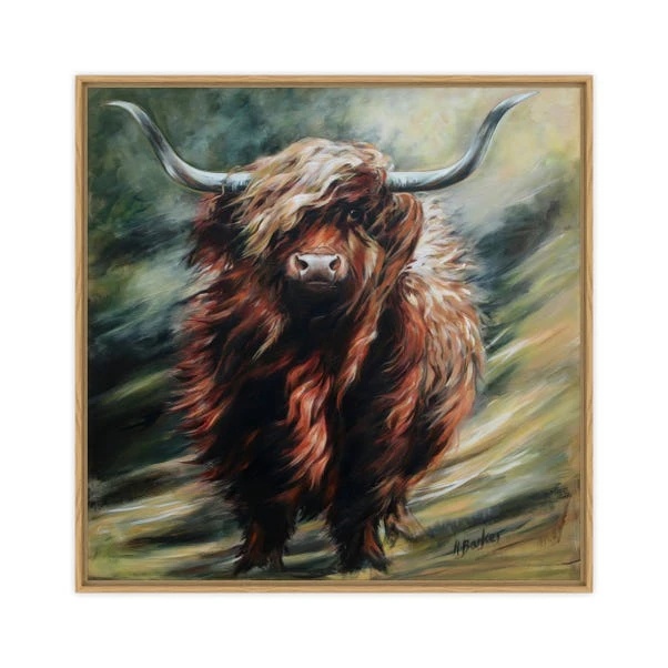 Add character to your space with this expressive Highland cow portrait by artist Hilary Barker. The flowing fur, detailed horns, and soft brushstrokes create a sense of texture and movement, bringing the artwork to life. Warm earthy tones contrast beautifully against a vibrant green background, making it a striking focal point in any room. Printed on canvas and float framed in a natural wood-coloured frame, it offers a stylish and contemporary finish. Ready to hang, this piece is perfect for adding a touch of rustic charm to your home.