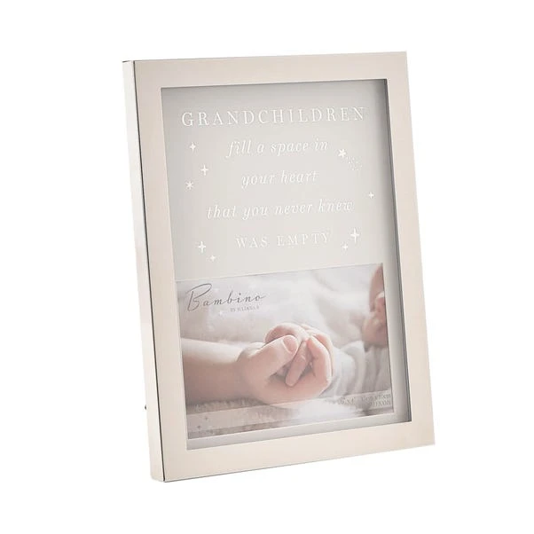 A steel photo frame from BAMBINO BY JULIANA®. This exquisite landscape frame is an optimal way to beautifully present the photograph of new family arrivals. It features finished steel and rectangular aperture, enhanced by silver detailing, including ‘Grandchildren fill a space in your heart’ wording. The rear attachments offer the option of either standing the frame upright or hanging it on the wall. The frame is packaged in a Bambino closed gift box.