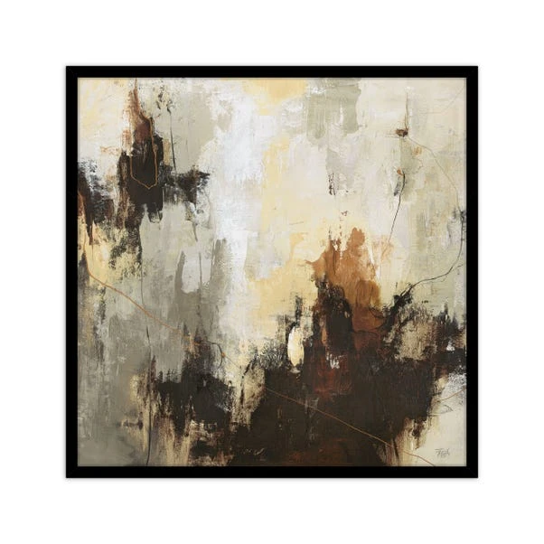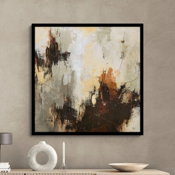 This abstract print features natural colours and is a printed reproduction of artwork by Design Fabrikken. The print is finished with light texture. It comes ready to hang in a black frame with D rings on the reverse.
