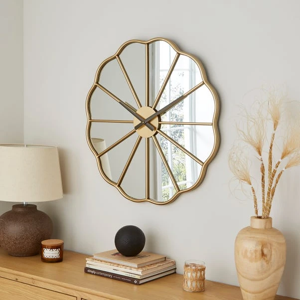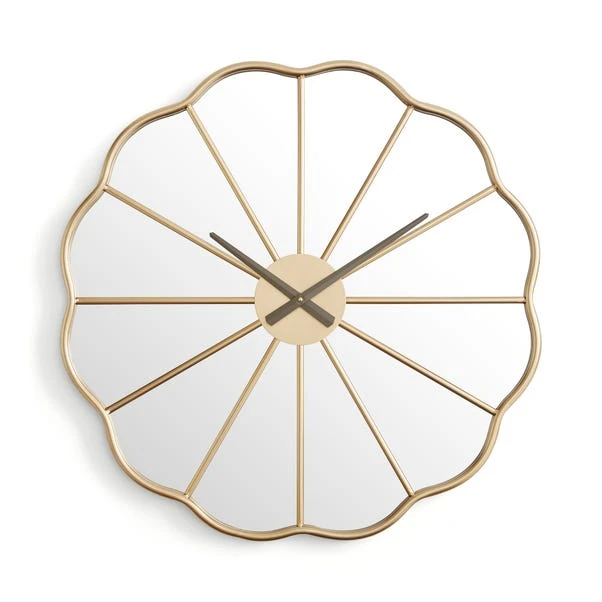 Bring style and a floral accent to your décor with this mirrored wall clock. The subtle, modern floral shape is an eye-catching statement paired with a mirrored face and a gold metal finish. It’s easy to hang on the wall using the keyhole and takes just 1 AA battery (not included) to keep it moving. It has a silent movement for tick-free timekeeping.