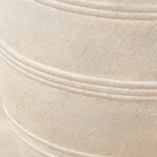 With its elegant urn shape and soft grey wash finish, this decorative vase brings timeless appeal to any space. The ribbed detailing and handles add a touch of classic design. Available in two sizes, it’s made from fibrestone, making it lightweight yet durable, ideal for indoor use, but please note, this vase is not waterproof. It’s perfect for styling as a statement piece or pairing with faux blooms.