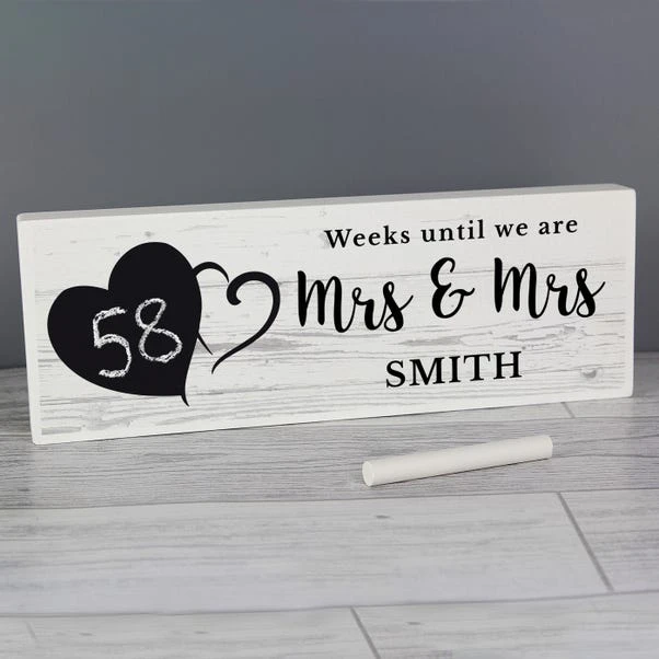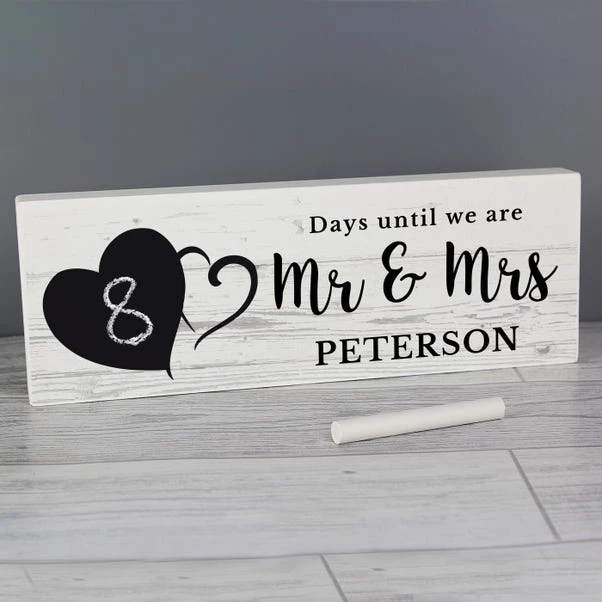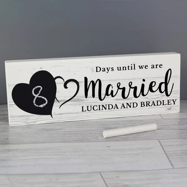Personalised Rustic Chalk Countdown Wooden Block Sign: Make the countdown to the big day extra special with this rustic wooden block sign. Personalised with your message, it’s a fun way to build anticipation for the wedding day.
