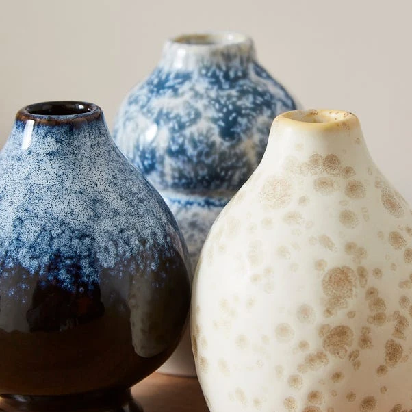 This set of 3 ceramic bud vases are a great way to introduce colour and coordination to your space. They all feature reactive glazes, making each pattern and colour completely unique. This set of 3 vases are a lovely way to display smaller stems, both real and artificial, and can be positioned together for eye-catching impact, or separately throughout the home for a coordinated feel.