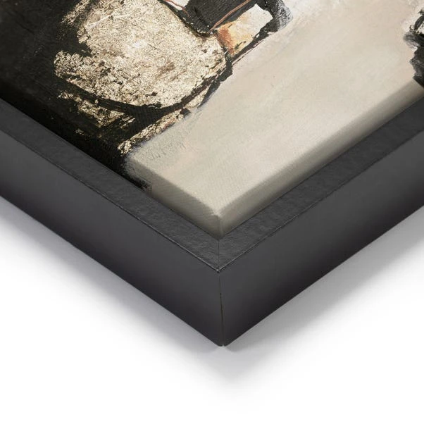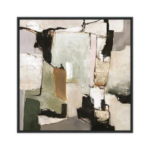 This striking abstract artwork by Design Fabrikken features overlapping geometric shapes, beautifully layered to create a sense of movement and balance. Framed in sleek, black grained moulding, it highlights the moody elegance of the piece, while the float frame adds depth to the canvas. The earthy tones of green, beige, and brown are accented by black and white elements, giving the artwork a timeless appeal. Perfectly sized to make an impact, it brings a sophisticated touch to any room. Ready to hang, this piece adds structure and is ideal for creating a focal point in any space.