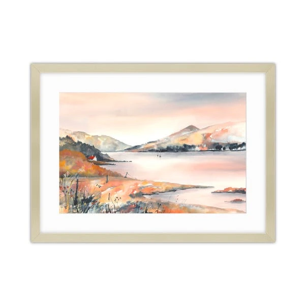 This stunning watercolour painting by Elizabeth Baldin captures a tranquil coastal landscape, evoking a sense of calm and serenity. Soft peach, orange, and blue hues blend beautifully, creating a warm atmosphere that enhances any room. The distant hills and reflections on the water add depth, making this artwork feel both peaceful and expansive. Set in a champagne-coloured frame with a glass finish, the print is mounted and ready to hang, making it a hassle-free addition to your décor. Perfect for bringing a soothing touch of the coast into your home.