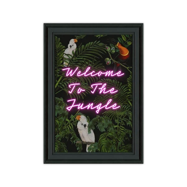 Bring bold, dramatic flair to your walls with this striking ‘Welcome To The Jungle’ print, featuring vibrant neon pink text and lush tropical foliage. The artwork is framed in a sleek black stepped frame, offering a contemporary finish that complements the edgy design. Designed by Vintage Posters, this piece combines contemporary vibes with a touch of edginess, making it a perfect fit for modern, eclectic, or maximalist interiors. The rich colours of deep red, neon pink, and vivid greens contrast beautifully against a dark black background, creating a captivating visual impact. Ready to hang and finished with glass for a polished look, this print is sure to stand out in any room and will bring a touch of vibrant energy to your space.
