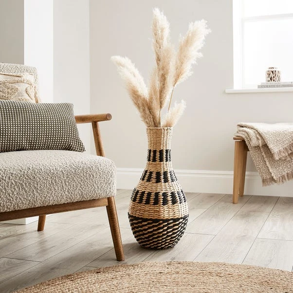 This black and natural patterned woven jug vase is made from natural rush and is ideal for boho interiors. This vase is perfect for displaying artificial flowers for a lovely feature and is a great size for setting on the floor, bringing height and impact to your decor.